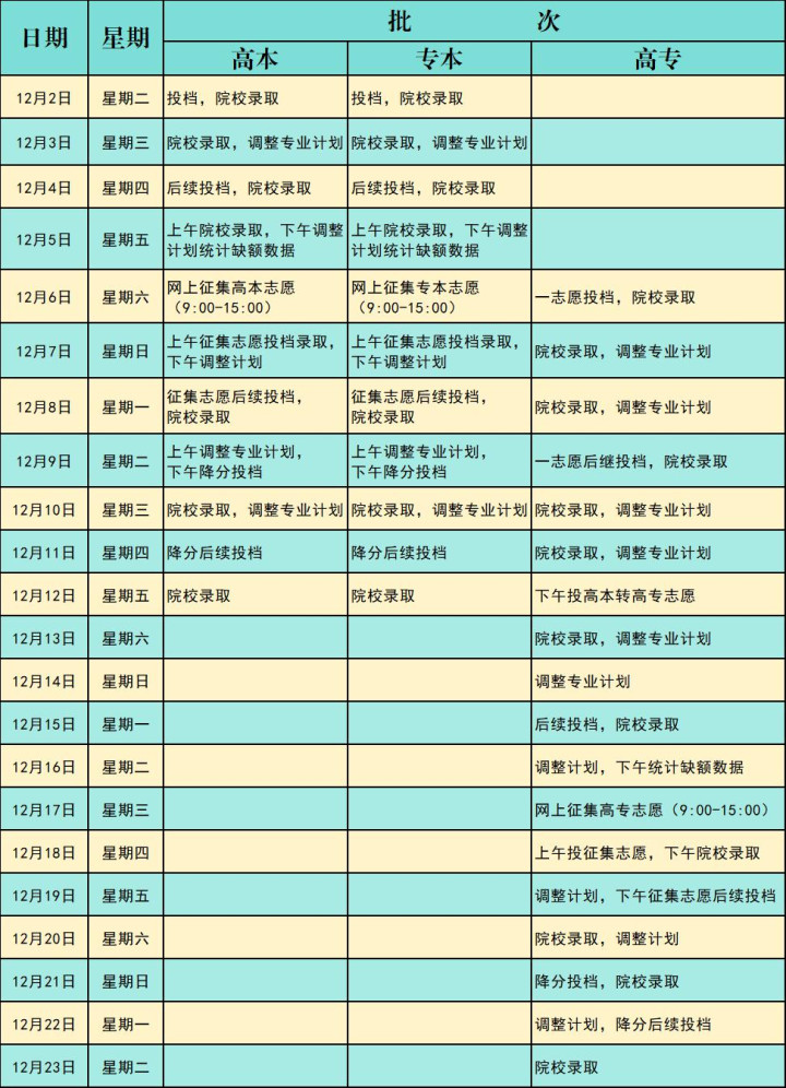 2025年江西省成人高校招生录取工作将于2025年12月2日至23日进行:2日至12日高中起点升本科录取;2日至12日专科起点升本科录取;6日至23日高中起点升专科录取。具体时间安排见附件。每层次征集志愿前、录取结束后,考生可登录江西省教育考试院官网查询录取结果。